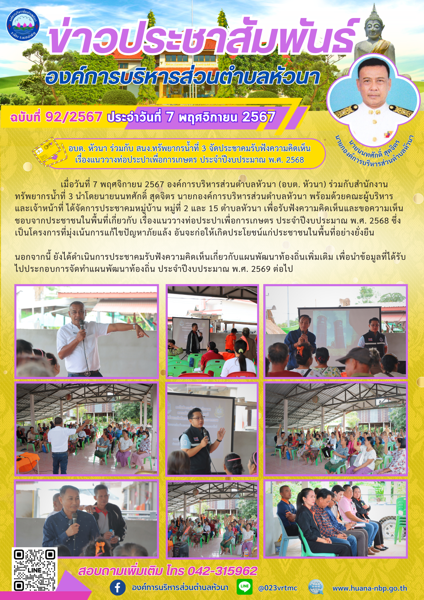 อบต. หัวนา ร่วมกับ สนง.ทรัพยากรน้ำที่ 3 จัดประชาคมรับฟังความคิดเห็นเรื่องแนววางท่อประปาเพื่อการเกษตร ประจำปีงบประมาณ พ.ศ. 2568 [7 พฤศจิกายน 2567]