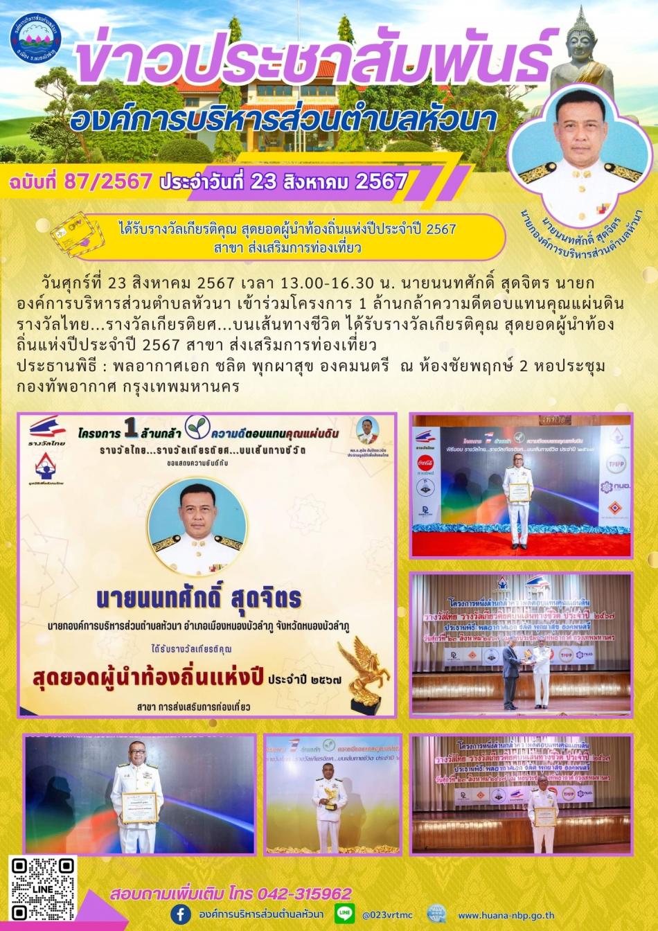 ได้รับรางวัลเกียรติคุณ สุดยอดผู้นำท้องถิ่นแห่งปีประจำปี 2567 สาขา ส่งเสริมการท่องเที่ยว [23 สิงหาคม 2567]