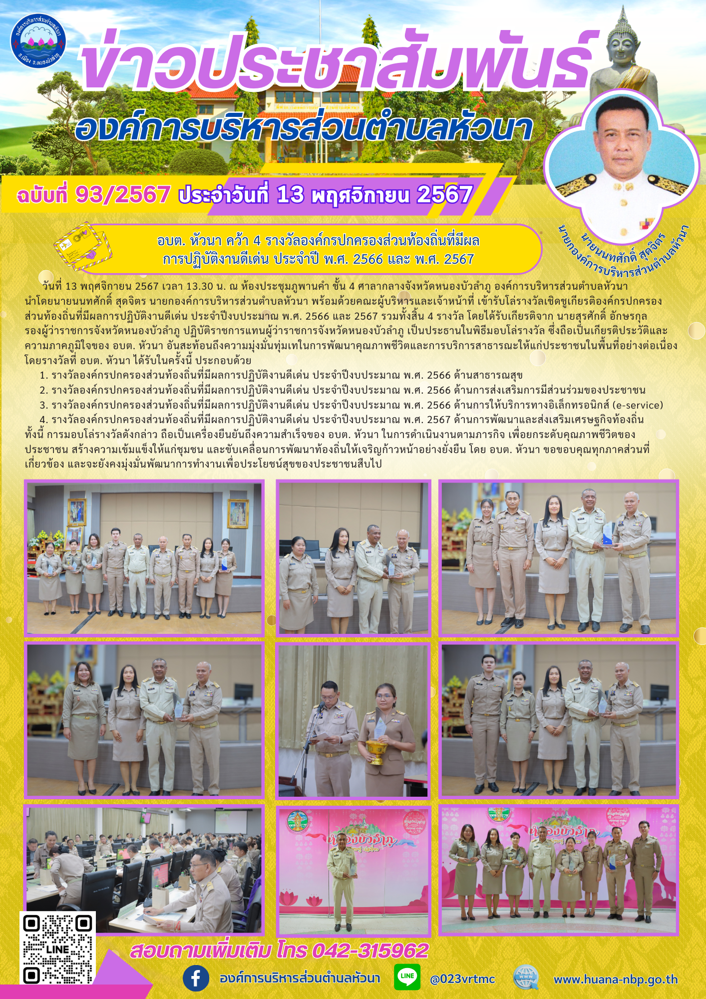อบต. หัวนา คว้า 4 รางวัลองค์กรปกครองส่วนท้องถิ่นที่มีผลการปฏิบัติงานดีเด่น ประจำปี พ.ศ. 2566 และ พ.ศ. 2567 [13 พฤศจิกายน 2567]