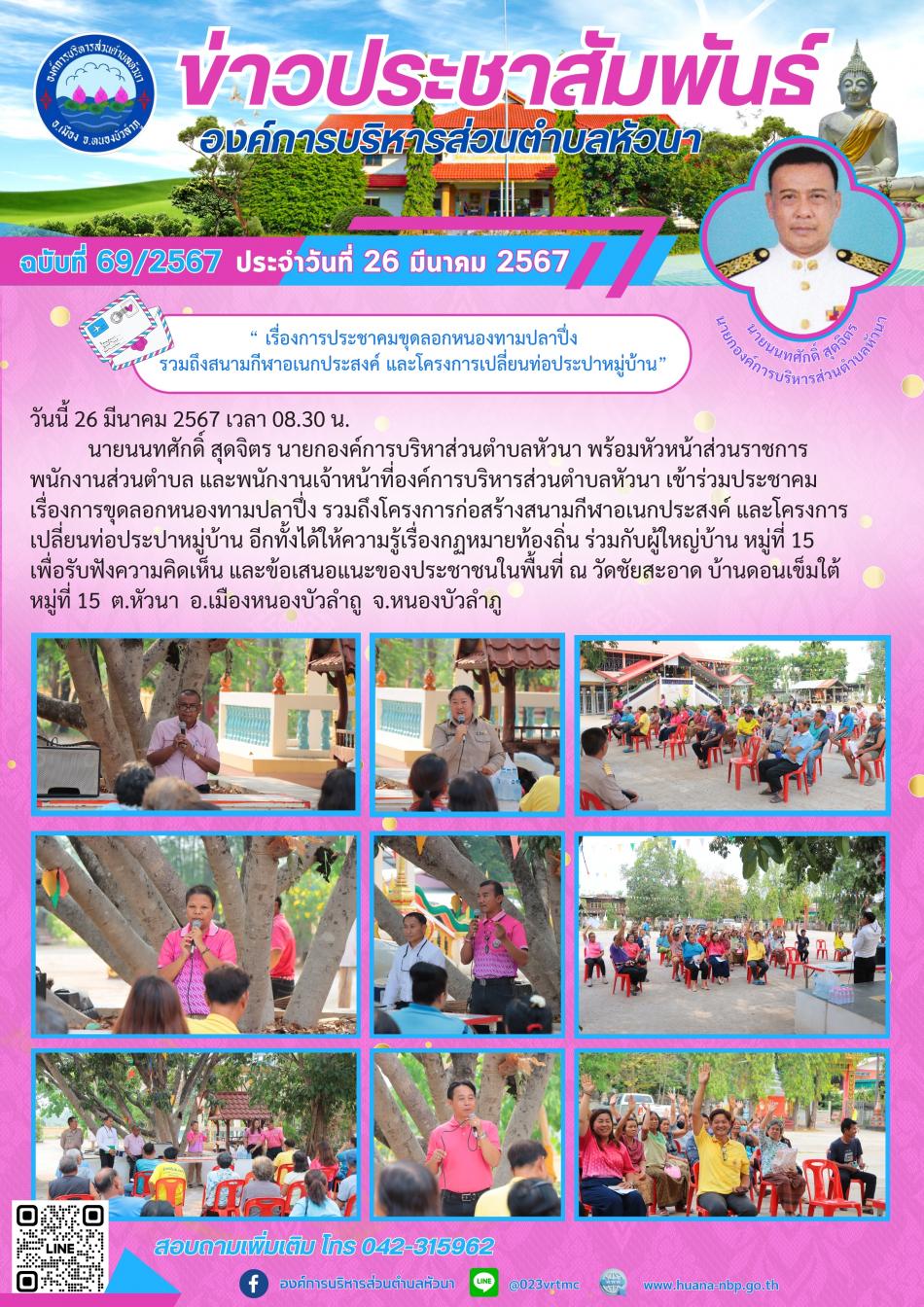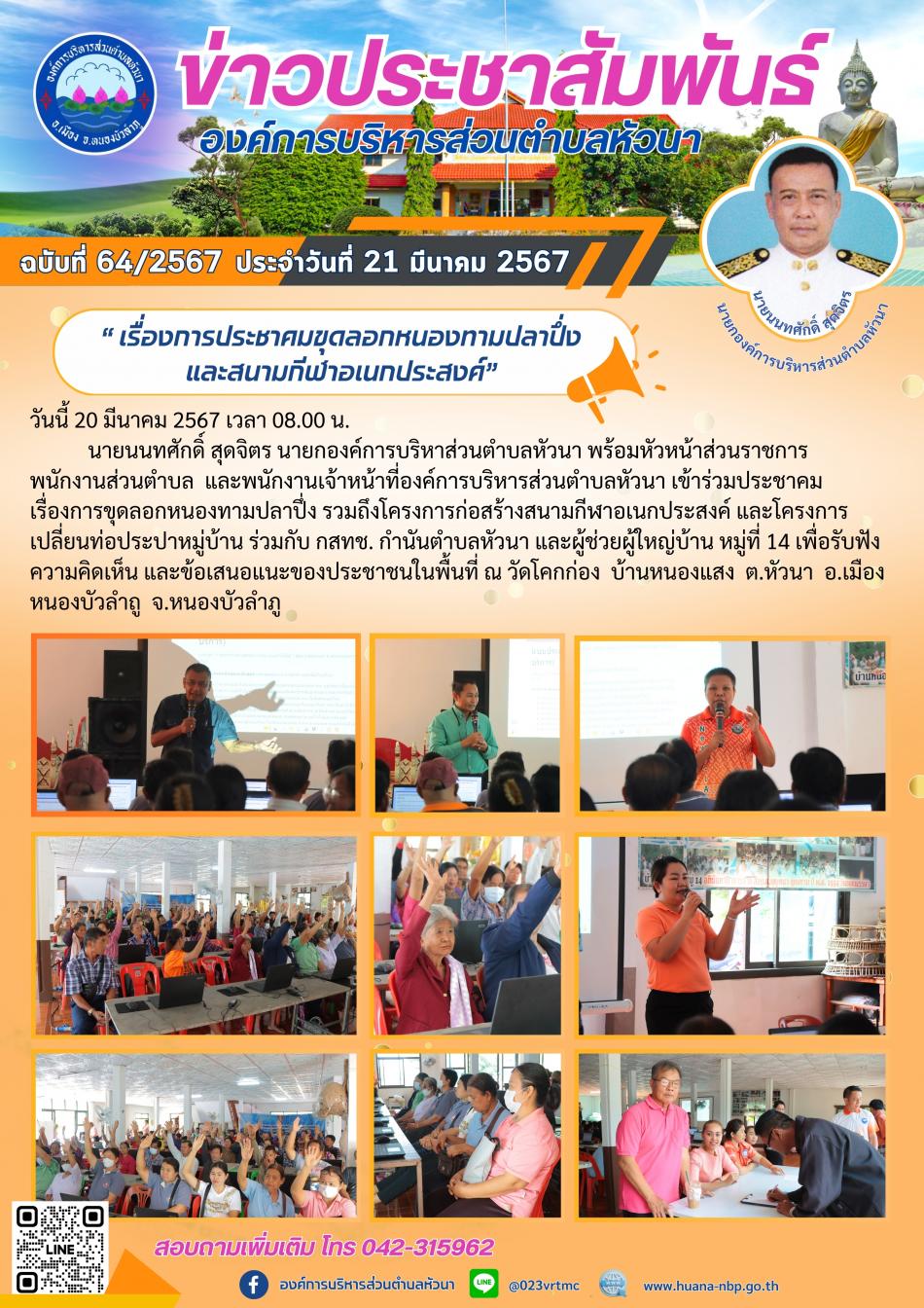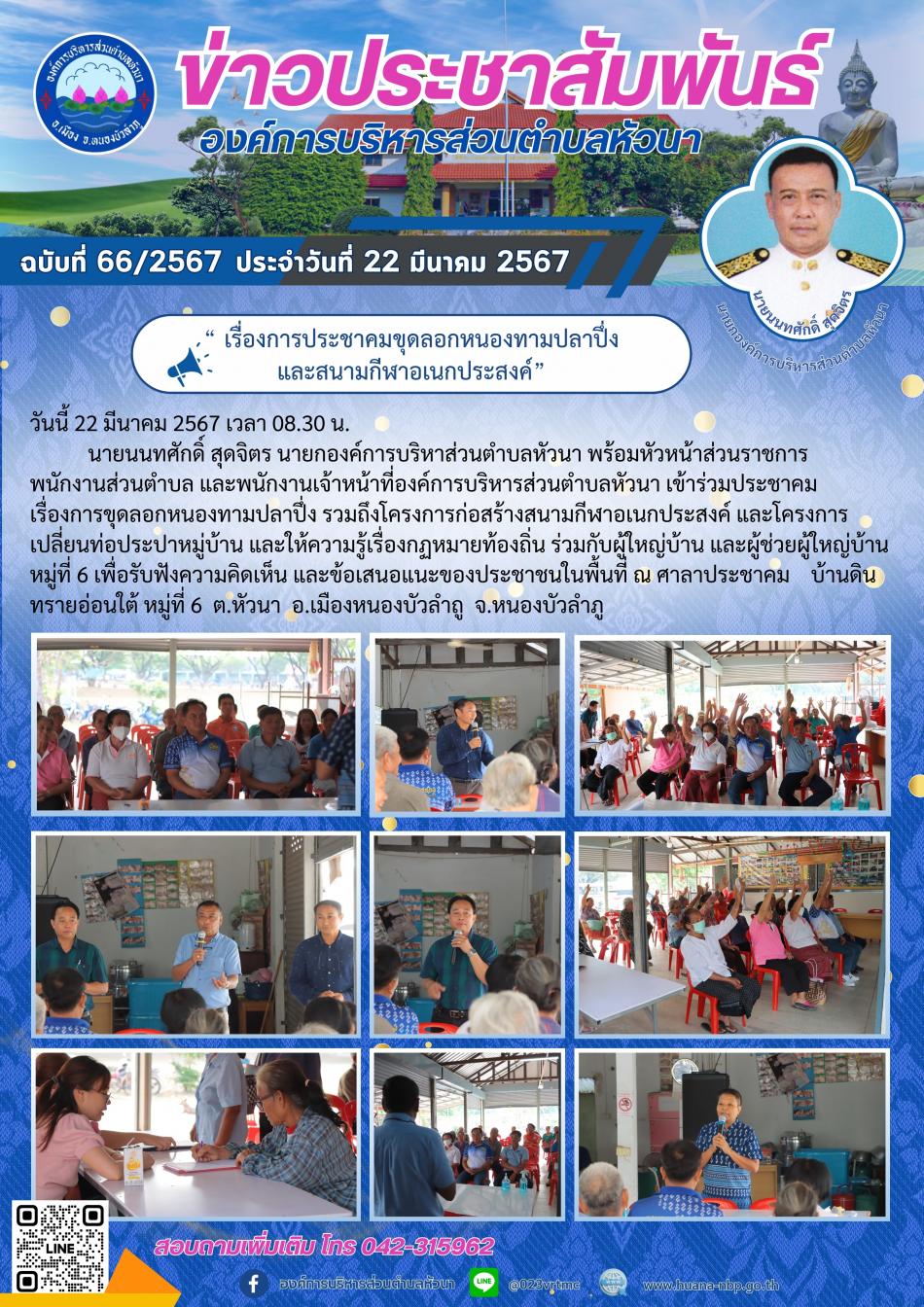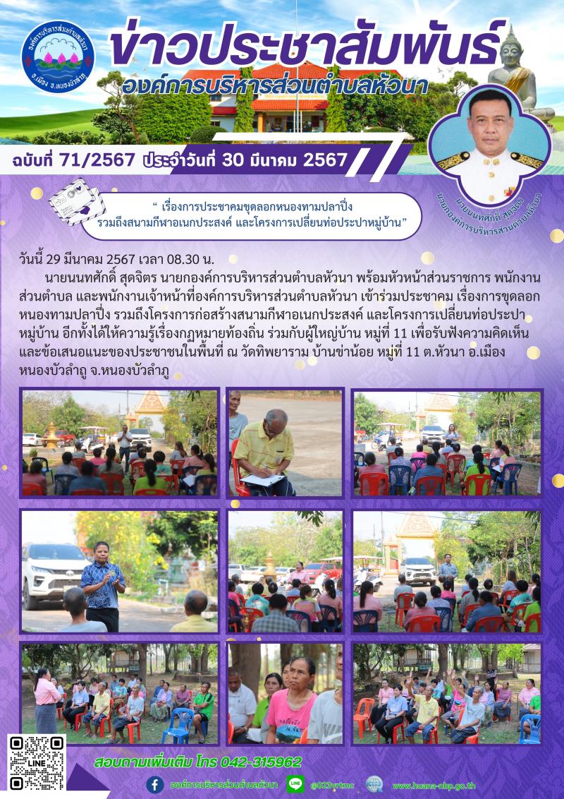 “ เรื่องการประชาคมขุดลอกหนองทามปลาปึ่ง รวมถึงสนามกีฬาอเนกประสงค์ และโครงการเปลี่ยนท่อประปาหมู่บ้าน” [29 มีนาคม 2567]