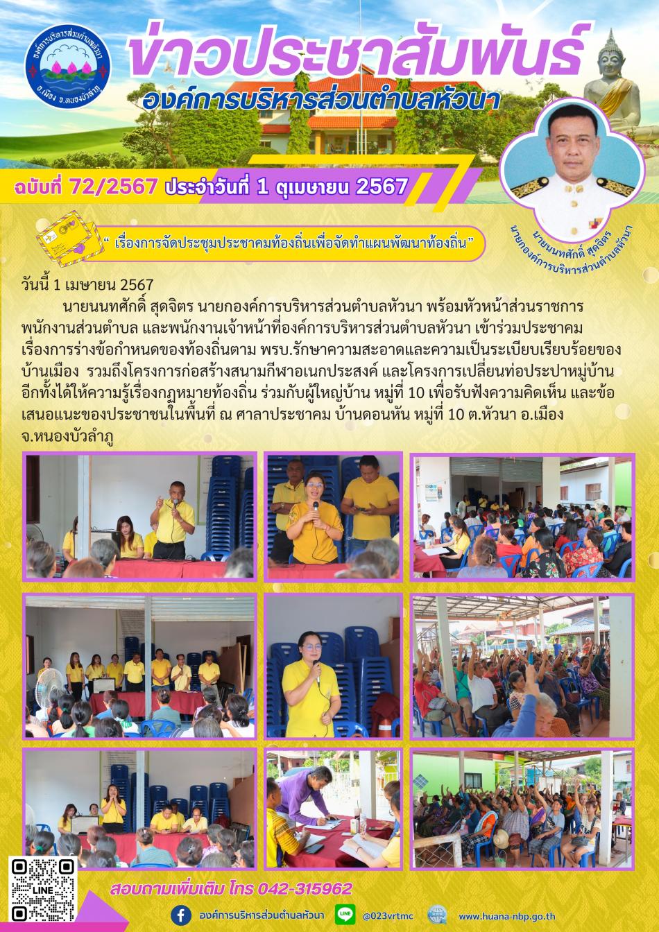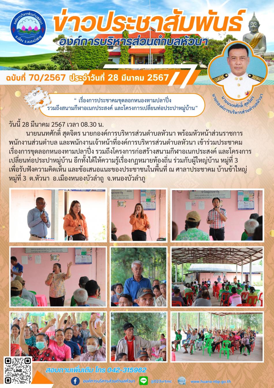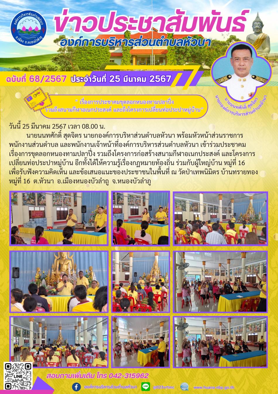 “ เรื่องการประชาคมขุดลอกหนองทามปลาปึ่ง รวมถึงสนามกีฬาอเนกประสงค์ และโครงการเปลี่ยนท่อประปาหมู่บ้าน” [29 มีนาคม 2567]