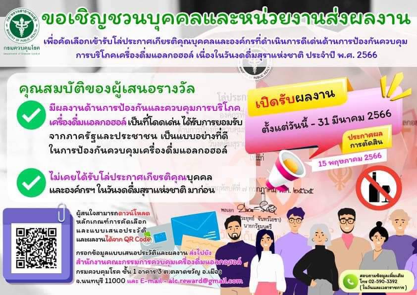 ประชาสัมพันธ์สรรหาบุคคลและองค์กรที่ดำเนินการดีเด่นการป้องกันควบคุมการบริโภคเครื่องดื่มแอลกอฮอล์ เพื่อรับโล่ประกาศเกียรติคุณ เนื่องในวันงดดื่มสุราแห่งชาติ ประจำปี พ.ศ.2566