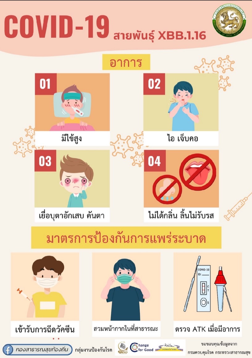 รายละเอียด : ????ประชาสัมพันธ์ : มาตรการเฝ้าระวังและป้องกันการแพร่ระบาดของโรคติดเชื้อไวรัสโคโรนา 2019 (COVID – 19) สายพันธุ์ XBB.1.16