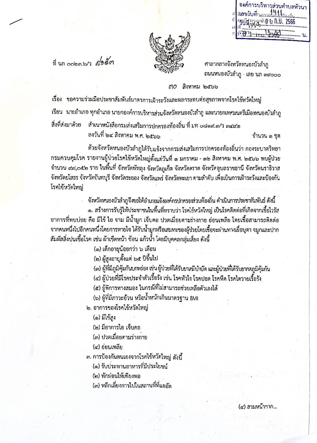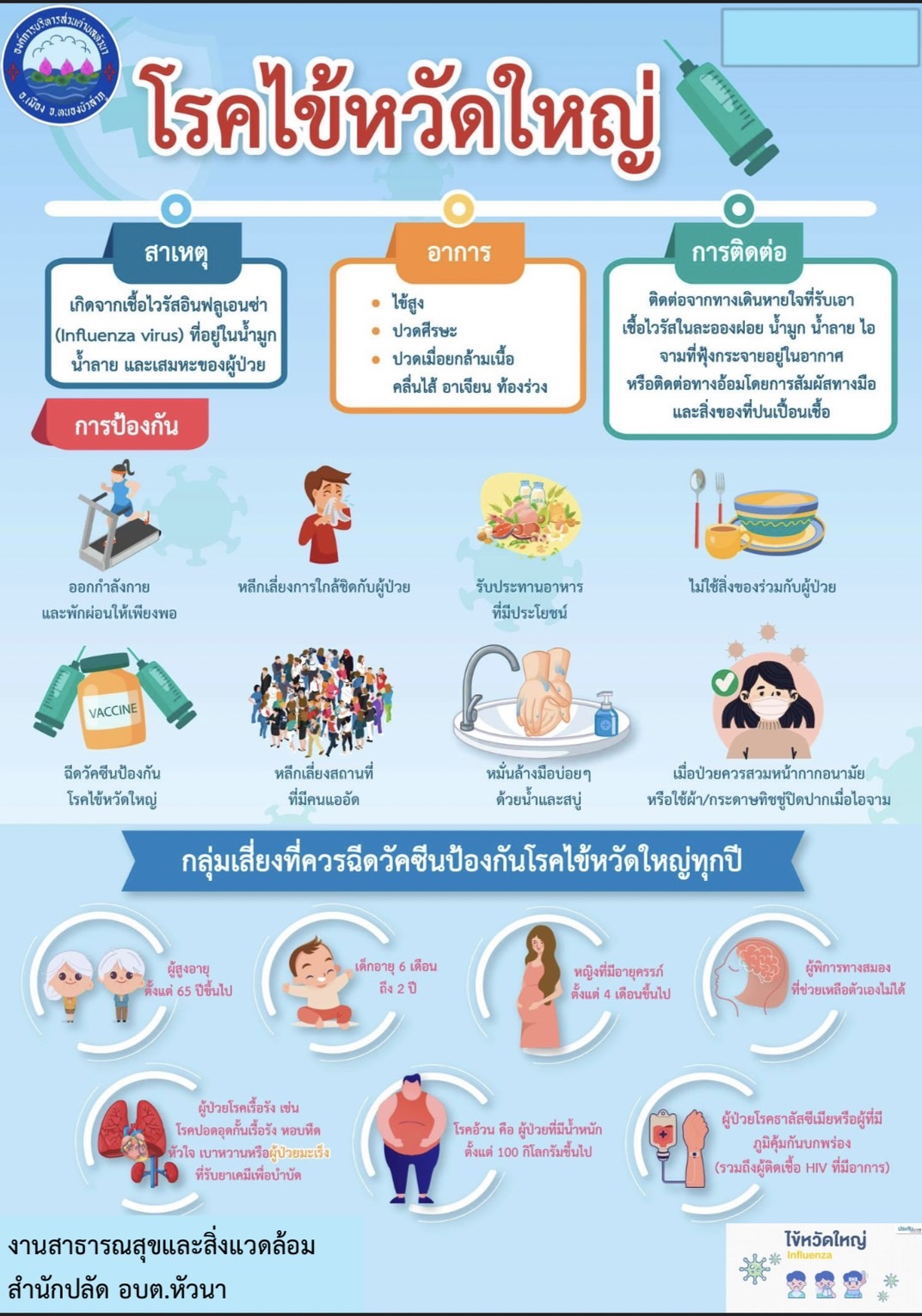 รายละเอียด : งานสาธารณสุขและสิ่งแวดล้อม สำนักปลัด อบต.หัวนา ขอประชาสัมพันธ์ "มาตรการเฝ้าระวังและผลกระทบต่อสุขภาพจากโรคไข้หวัดใหญ่" ด้วยกองระบาดวิทยากรมควบคุมโรครายงานผู้ป่วยโรคไข้หวัดใหญ่ตั้งแต่วันที่ 1 มกราคม - 12 สิงหาคม 2566 พบผู้ป่วยจำนวน 97,052 ราย ในพื้นที่จังหวัดพัทลุง จังหวัดภูเก็ต จังหวัดตราด จังหวัดอุบลราชธานี จังหวัดนราธิวาสจังหวัดยโสธร จังหวัดจันทบุรี จังหวัดระยอง จังหวัดแพร่จังหวัดพะเยา ตามลำดับ