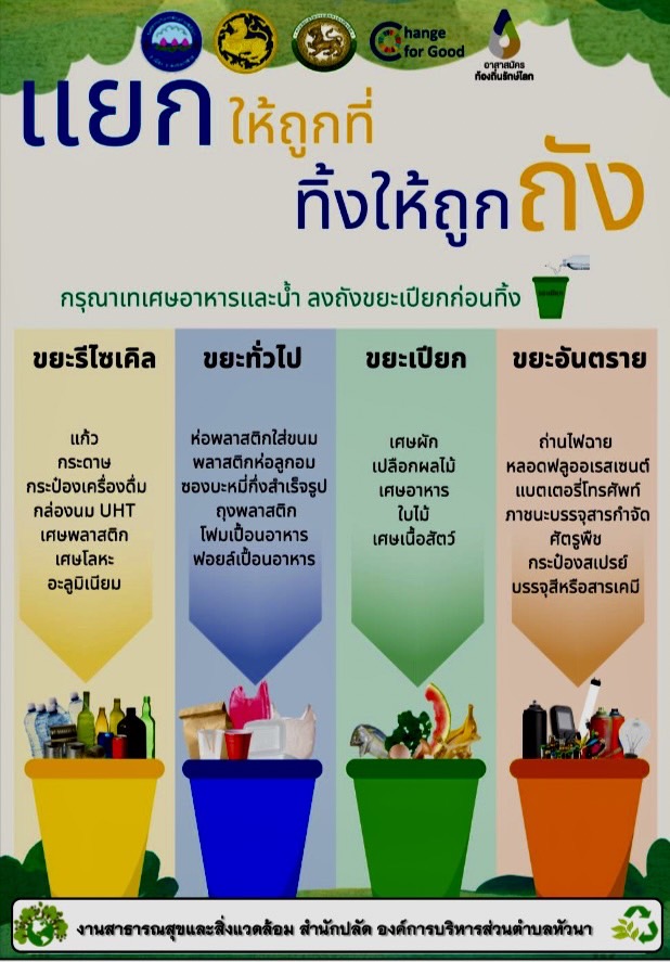 ชื่อเรื่อง : ขอประชาสัมพันธ์เชิญชวนประชาชนในพื้นที่ทั้ง 12 หมู่บ้าน ร่วมกัน "คัดแยกขยะอย่างถูกวิธี แยกให้ถูกที่ ทิ้งให้ถูกถัง" เพื่อเป็นการคัดเเยกขยะจากตั้งเเต่ต้นทาง และเพื่อเป็นการลดปริมาณขยะที่จะเกิดขึ้นนั้น