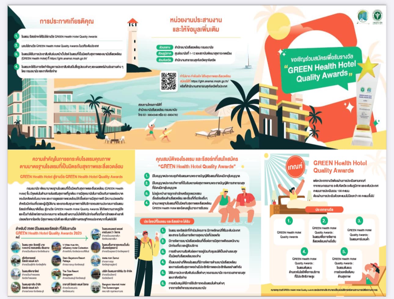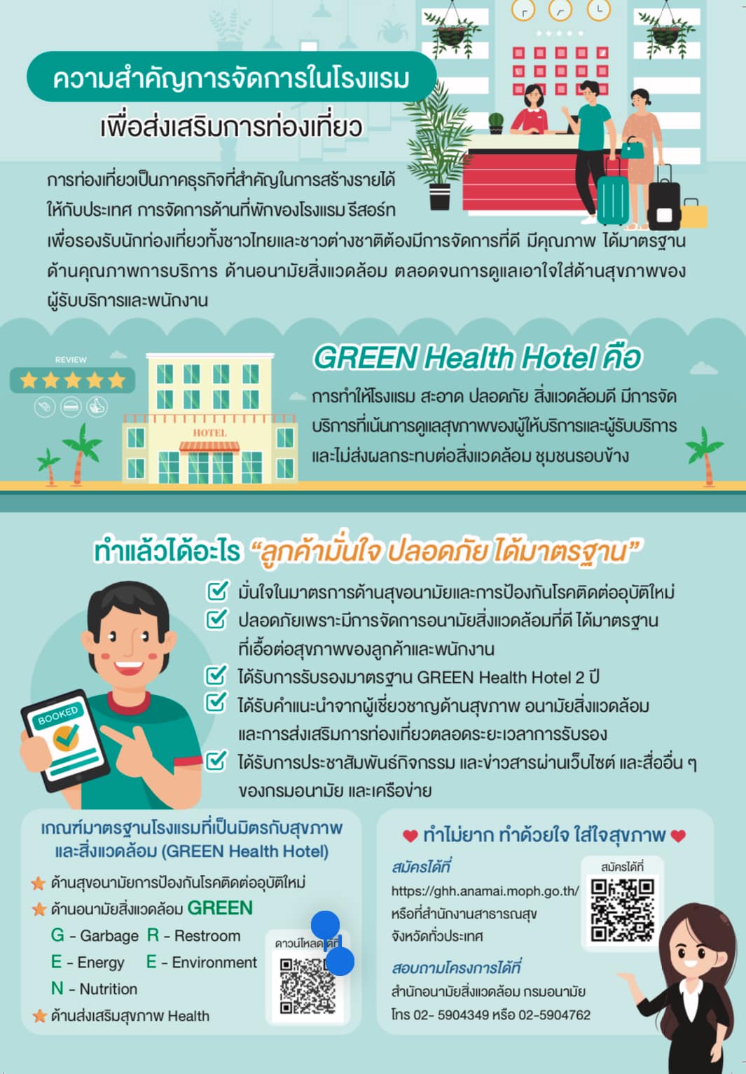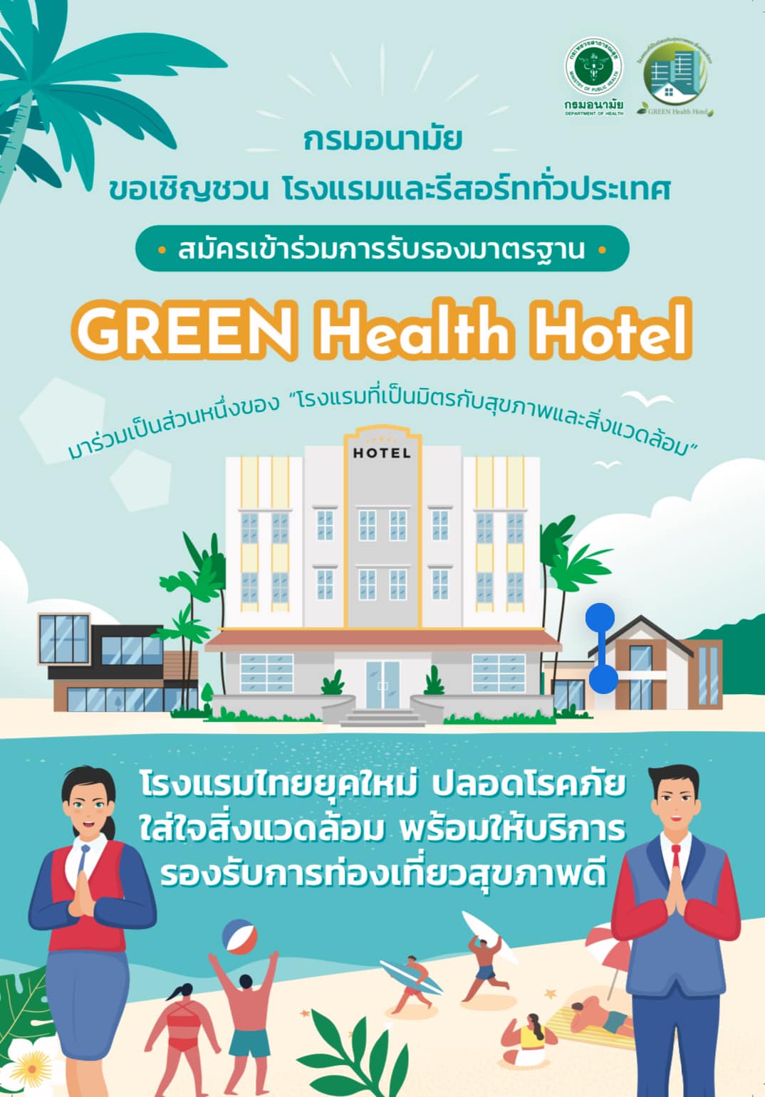 ชื่อเรื่อง : ประชาสัมพันธ์ ขอความร่วมมือในการตรวจประเมินและรับรองมาตรฐานโรงแรมที่เป็นมิตรกับสุขภาพและสิ่งแวดล้อม (GREEN Health Hotel)