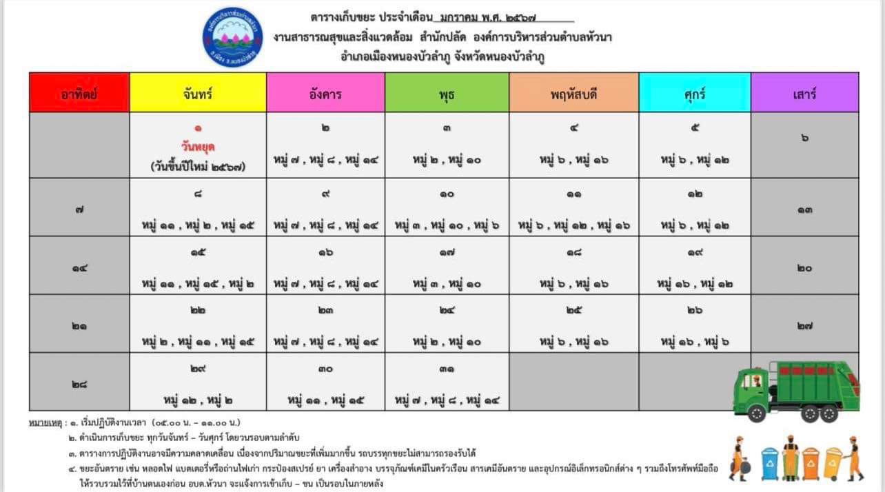 งานสาธารณสุขและสิ่งแวดล้อม สำนกปลัด องค์การบริหารส่วนตำบลหัวนา (megaphone)ขออนุญาตประชาสัมพันธ์ ตารางเก็บขนขยะ ประจำเดือน มกราคม 2567(fire hydrant)(trash can)(megaphone)
