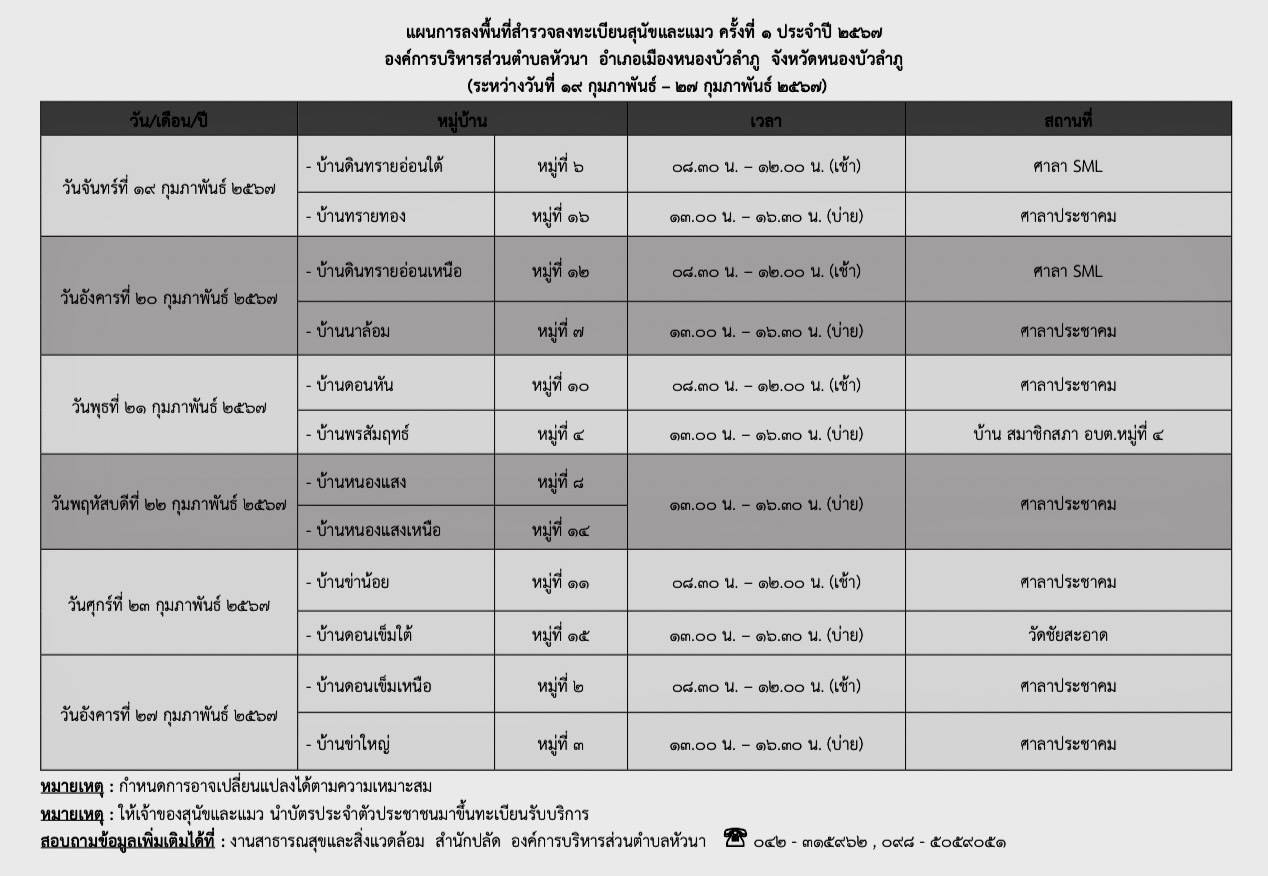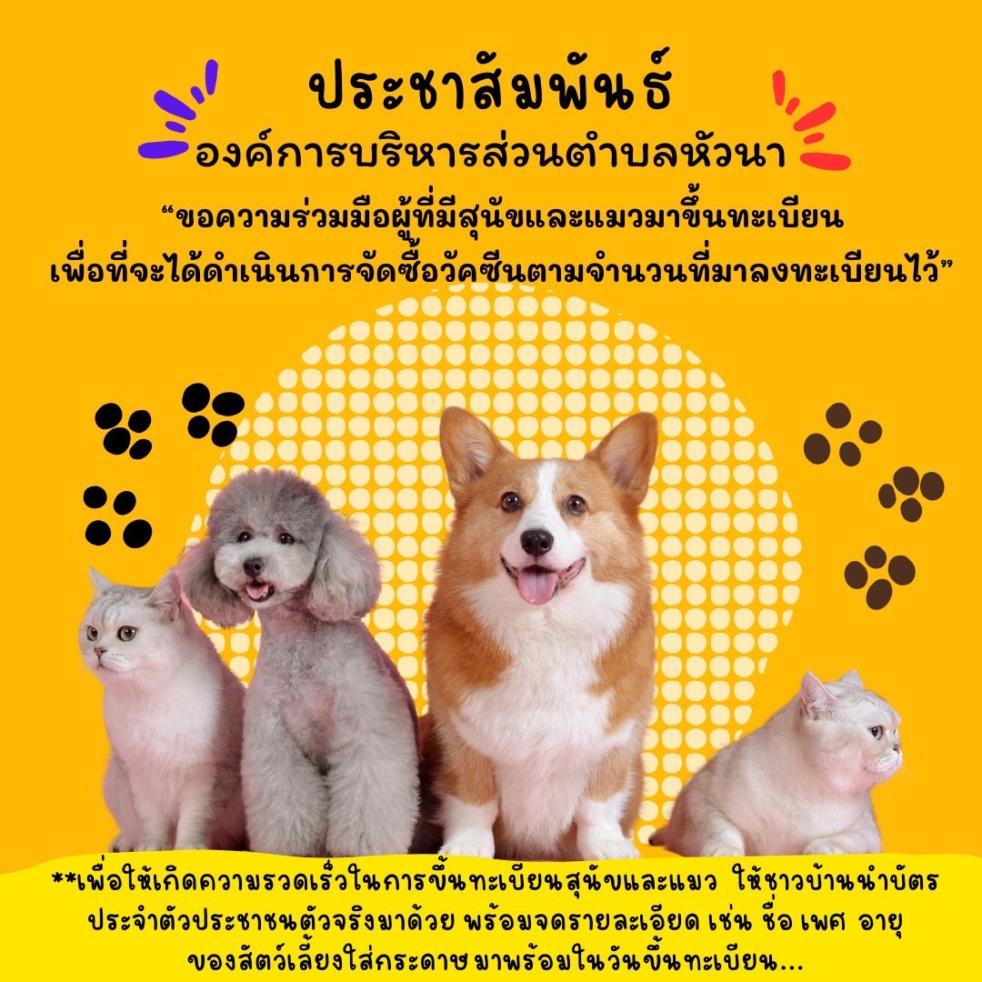 ชื่อเรื่อง : ประชาสัมพันธ์ งานสาธารณสุขและสิ่งแวดล้อม สำนักปลัด อบต.หัวนา กำหนดการสำรวจและรับขึ้นทะเบียนสุนัขและแมว นอกสถานที่ ระหว่างวันที่ 19 - 27 กุมภาพันธ์ 2567