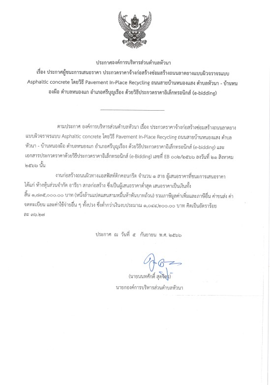 ชื่อเรื่อง : ประกาศองค์การบริหารส่วนตำบลหัวนา เรื่อง ประกวดราคาจ้างก่อสร้างซ่อมถนนลาดยางแบบผิวจราจรแบบ Asphaltic Concrete โดยวิธี Pavement ln-Recycling ถนนสายบ้านหนองแสง ตำบลหัวนา-บ้านหนองผือ ตำบลหนองแก อำเภอศรีบุญเรือง ด้วยวิธีประกวดราคาอิเล็กทรอนิกส์