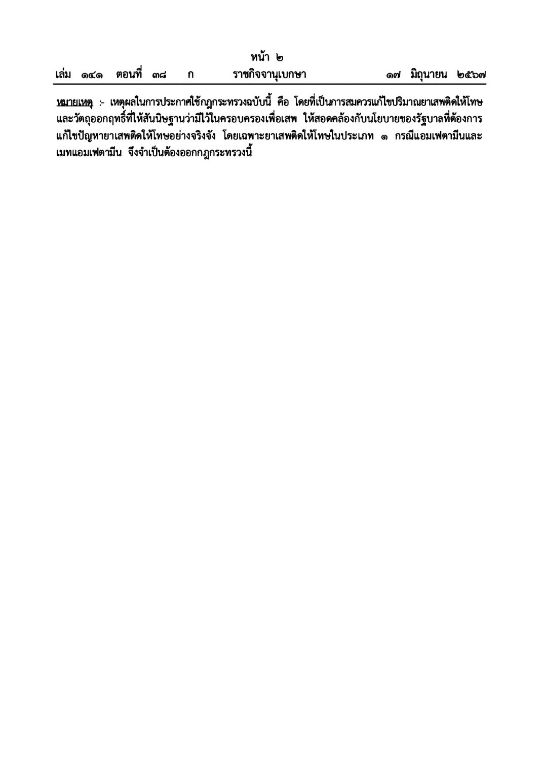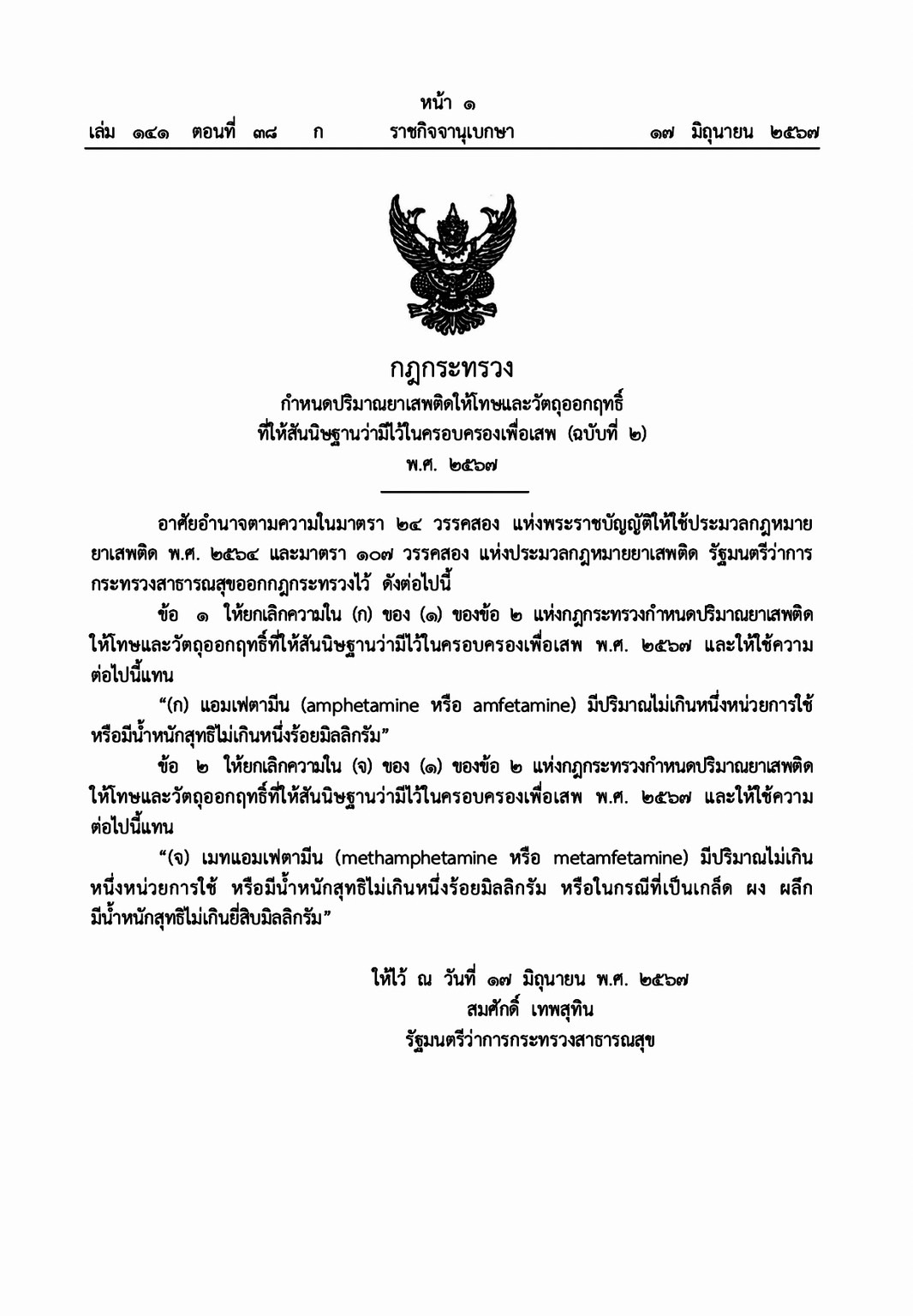 “ เรื่อง กฎกระทรวงกำหนดหลักเกณฑ์ในการควบคุมปริมาณยาเสพติดให้โทษและวัตถุออกฤทธิ์ที่ให้สันนิษฐานว่ามีไว้ในครอบครองเพื่อเสพ (ฉบับที่ 2) พ.ศ. 2567 “