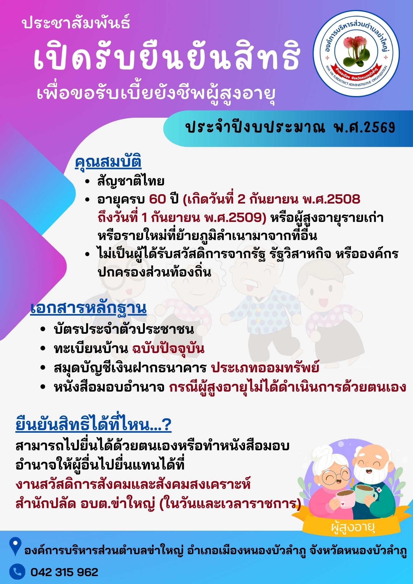 ชื่อเรื่อง : ประกาศ เปิดรับยืนยันสิทธิ เพื่อขอรับเบี้ยผู้สูงอายุ ประจำปีงบประมาณ พ.ศ 2569