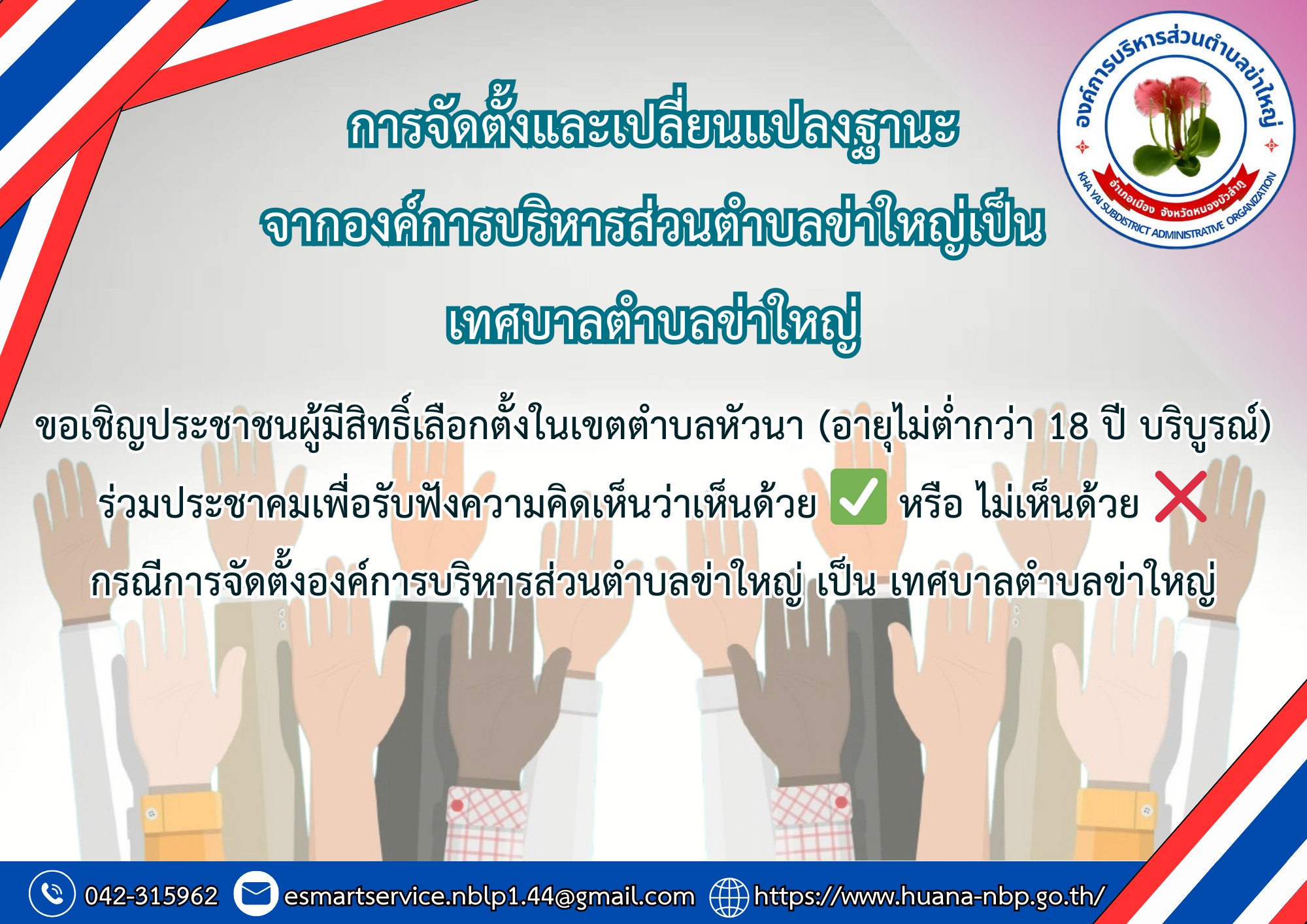 ชื่อเรื่อง : ประกาศขอเชิญประชาชนผู้มีสิทธิเลือกตั้งในเขตตำบลหัวนา (อายุไม่ต่ำกว่า 18 ปี บริบูรณ์) ร่วมประชาคมเพื่อรับฟังความคิดเห็น กรณีการจัดตั้งองค์การบริหารส่วนตำบลข่าใหญ่ เป็นเทศบาลตำบลข่าใหญ่