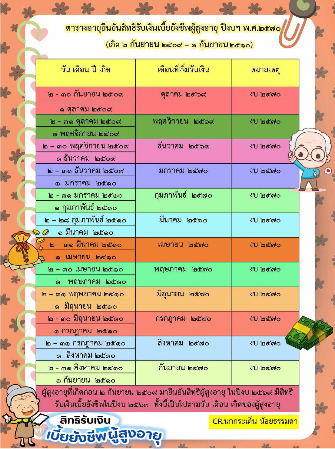 ตารางอายุยืนยันสิทธิรับเงินเบี้ยยังชีพผู้สูงอายุ ปีงบประมาณ พ.ศ.2570 (เกิด 2 กันยายน 2509 - 1 กันยายน 2510)